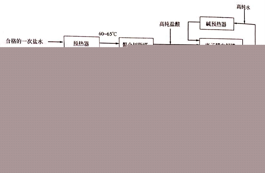 离子膜法烧碱生产任务可分为:①一次精制盐水设备;②二次盐水精制;③精制盐水电解;④氯氢气处理;⑤液氯生产等工作任务。其生产工艺过程如下图所示: