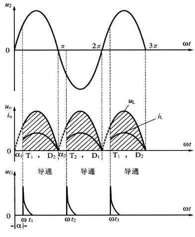 可见,当U2一定时,改变控制角α,即改变触发脉冲的加入时刻,就可改变直流输出电压的平均值,也就达到了可控整流的目的。